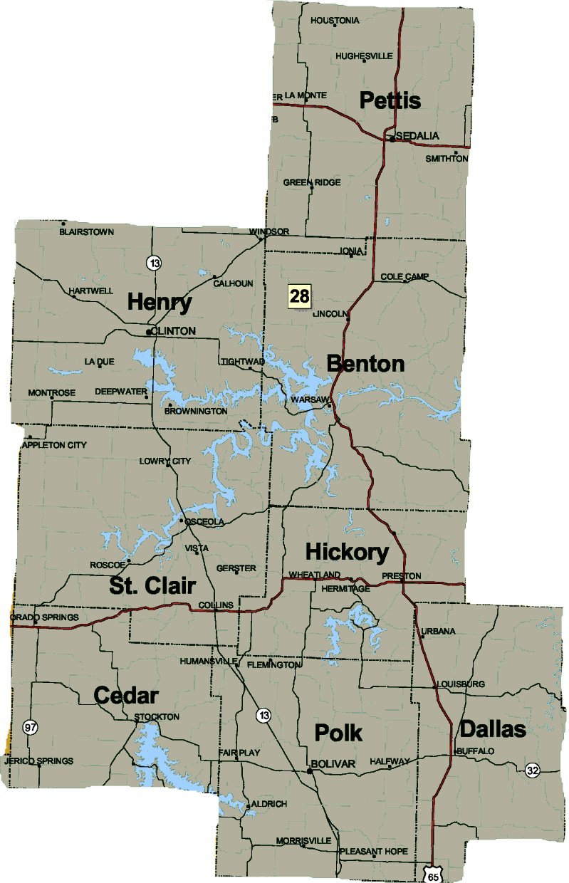 Barton, Benton, Cedar, Dallas, Henry, Hickory, Pettis, Polk and St. Clair