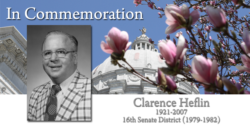 Clarence Heflin served the people of the 16th District (part of Jackson County). Born in Independence, he received his education from William Chrisman High School in Independence, and Washburn University in Topeka, Kansas. Senator Heflin served in the U.S. Air Force as a bomber pilot in Guam, Siapan and Tinian. He had his real estate license. Senator Heflin was elected to the House of Representatives in 1966, and re-elected in 1968, 1970, 1972, 1974 and 1976. He was elected to the Senate in 1978. (Democrat)