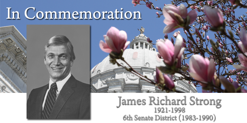 James Richard Strong served the people of the 6th District (Cole, Maries, Moniteau, Osage and Pulaski counties). Born in Marshfield, he received his education from Jefferson City schools. Senator Strong served in the U.S. Navy with the USS Phoenix at Pearl Harbor from 1939-1946. He worked in the commercial rental industry; was a cattle farmer; and was director of a savings and loan company. He was elected to the House of Representatives and served from 1973-1982. Senator Strong was elected to the Senate in 1982 and 1986. (Republican)