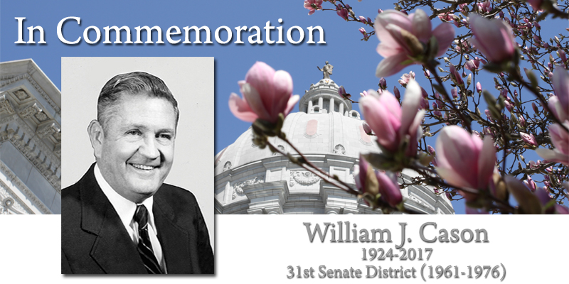 William J. Cason served the people of the 31st District, which at the time included Bates, Cass, Henry, Johnson, St. Clair and Vernon counties. Born in Higginsville, he attended Clinton High School and went on to graduate with honors from the University of Missouri-Columbia with a bachelor’s degree in business administration and an LL.B. degree. He was admitted to practice before the Supreme Court of Missouri and the federal courts and was the prosecuting attorney of Henry County for six years. He was a veteran of World War II, during which time he served as a bomber pilot with the U.S. Army Air Corps. He was first elected to the Senate in 1960 and re-elected in 1964, 1968 and 1972. He received the Harry S. Truman award for outstanding leadership and public service. Senator Cason served as majority floor leader and was twice unanimously elected by his fellow senators to the office of president pro tem of the Senate. He practiced law for a total of 61 years before retiring in 2012. (Democrat)