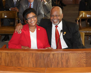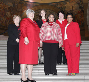 Friday, Feb. 1 - Sunday, Feb. 3, 2013 Friday night, I had the pleasure of attending a Shavuot at a dear friend's house where we read the Ten Commandments and celebrated the moment when God delivered his message to his people inscribed on two stone tablets, which he gave to Moses on Mount Sinai. The Ten Commandments still guide many of our laws today and have provided mankind with a blueprint regarding ethics and morality. Saturday, I gathered with some friends to discuss current legislation under discussion in the Senate relating to Missouri's Second Injury Fund, a reserve created to help injured workers when a current work-related injury combines with a prior disability to create an increased combined disability. Several of my colleagues in the Senate are currently fighting for workers' rights on this issue as the bill moves through the legislative process (SB 1). Sunday, I relaxed and packed for the American Heart Association's "Go Red Day at the Capitol." Sen. Gina Walsh, D-St. Louis; Sen. S. Kiki Curls, D-Kansas City; Sen. Chappelle-Nadal and members of the Missouri Senate staff celebrate the
