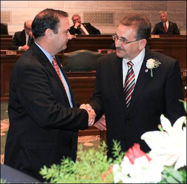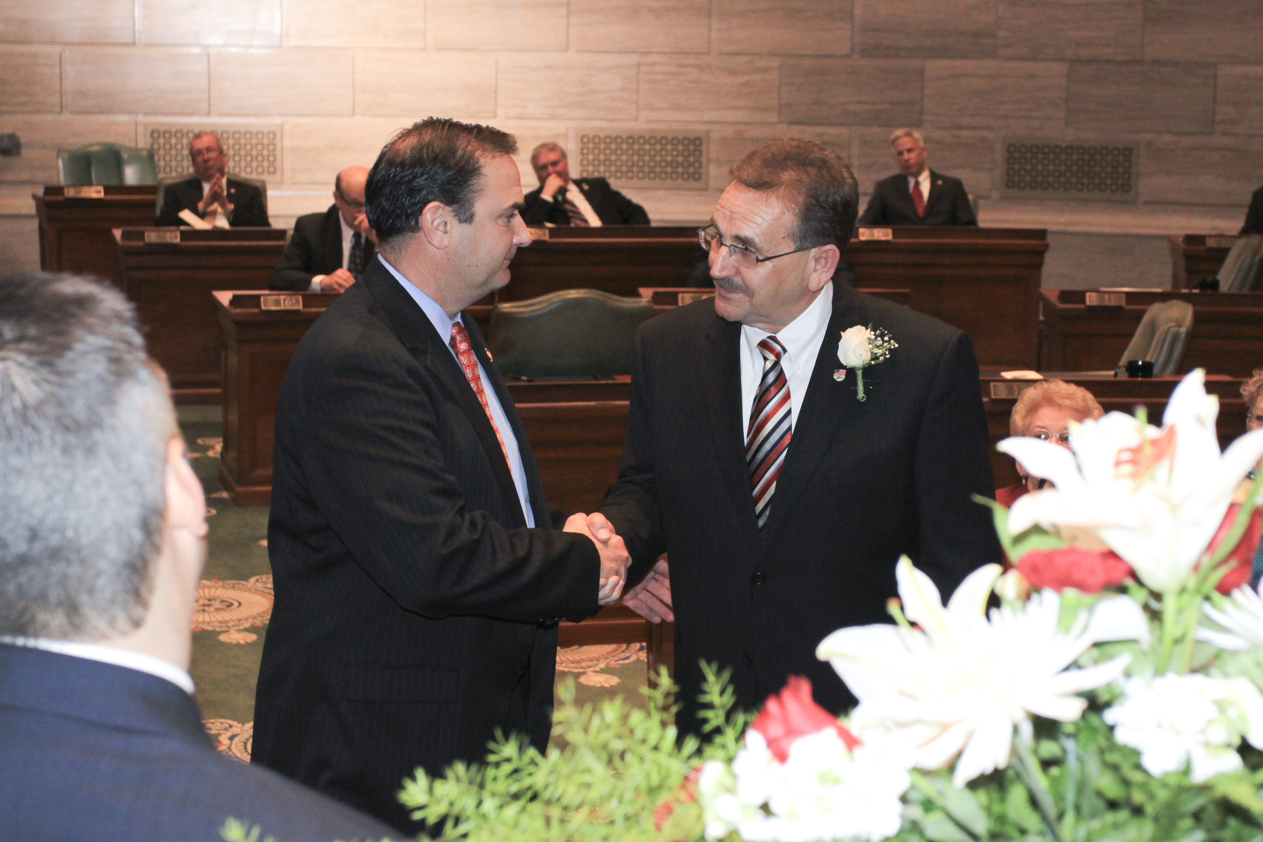 Sen. Libla shakes hands with fellow Sen. Mike Kehoe (R-Jefferson City) as he is introduced to the Senate President and colleagues in the upper chamber. For a full-resolution image of this photo, please contact Senate Communications at (53) 751-3824.