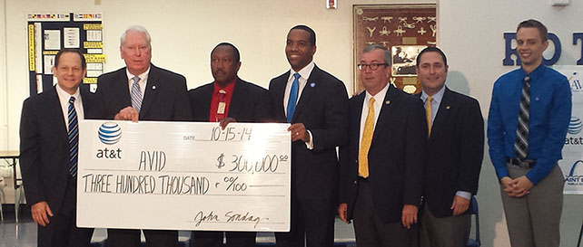 From left to right: St. Louis Mayor Francis Slay; AT&T Missouri President John Sondag; Dr. Wendell Brown, AVID Center's Central Division Director; David Hardy, St. Louis Public Schools Deputy Superintendent of Academics; Sen. Keaveny; Rep. Mike Colona; Michael Baird, AVID teacher, Cleveland Junior, Naval Academy, accept a donation to the AVID College Readiness System. |