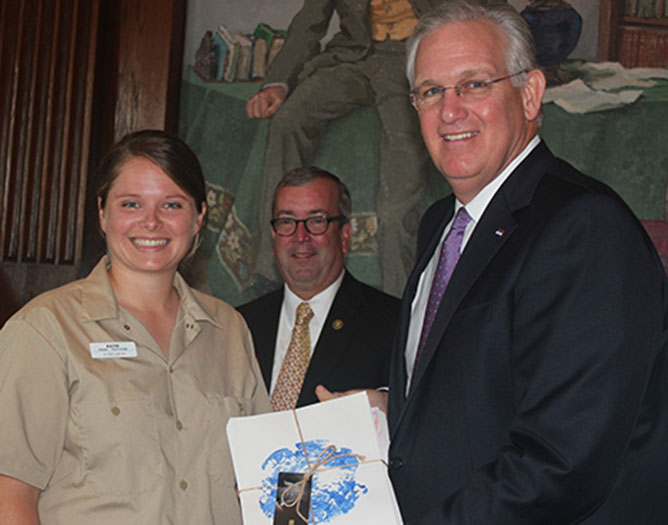 | Shown above, Sen. Keaveny, center, joins St. Louis Zookeeper, Katie Pilgram-Kloppe and Gov. Nixon as they pose for a photo with one-year-old Priya's footprint. Three zookeepers from across the state visited with the governor and Sen. Kevaeny to thank them for their support of “96 Elephants” campaign, which seeks to end the illegal poaching of these endangered animals. |