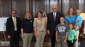 Today, Aug. 8, Sen. Keaveny joined the governor and three zookeepers from across the state to present them with letters from children that support the campaign. Sheila Samek, from Dickerson Park Zoo, has been a zookeeper for almost 15 years. Katie Muninger, from the Kansas City Zoo, has been an assistant supervisor there for seven years. Katie Pilgram-Kloppe has spent the last five years as an elephant caretaker for the zoo’s family of 10 Asian Elephants. She is the lead trainer for Priya – the zoo’s one-year-old elephant and the first ever born at the St. Louis Zoo.