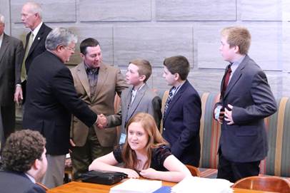 | Shown above, Sen. Richard shakes hands with Blake Miller and meets with Jacob Davis and Clayton Bowman, who were at the Capitol on Tuesday, March 4, as members of TeenPact Missouri. |