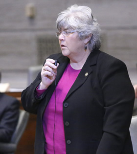 | Shown above, Sen. Gina Walsh discusses legislation on the floor of the Missouri Senate during the 2014 session. |