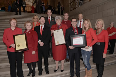 | Shown above, Sen. Walsh, center, joins with other officials at the Missouri Capitol to celebrate Go Red Day to raise awareness of the causes of heart disease and stroke. |