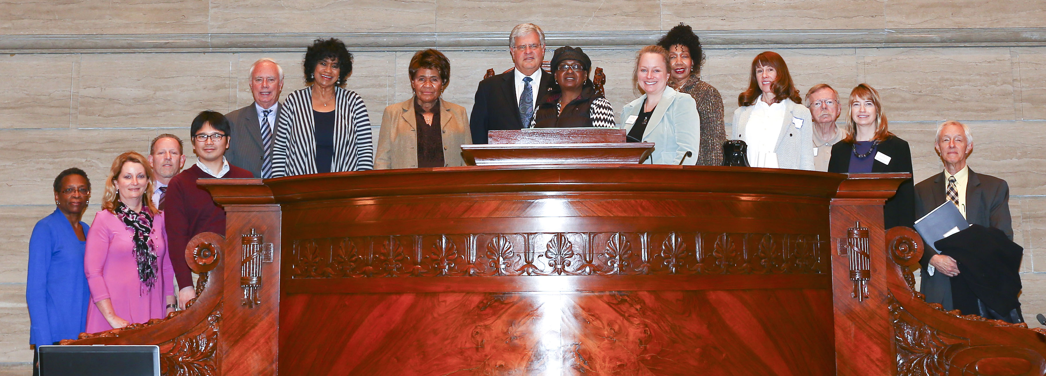Shown above, board and staff members from Voyce Volunteer Ombudsmen withSen. Ron Richard in the Senate Chamber on Feb. 11. |