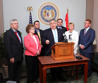 | Shown above, Sen. Paul Wieland is joined by fellow legislators at a news conference to call for the release of funding for Missouri’s river ports on Tuesday, March 31. |