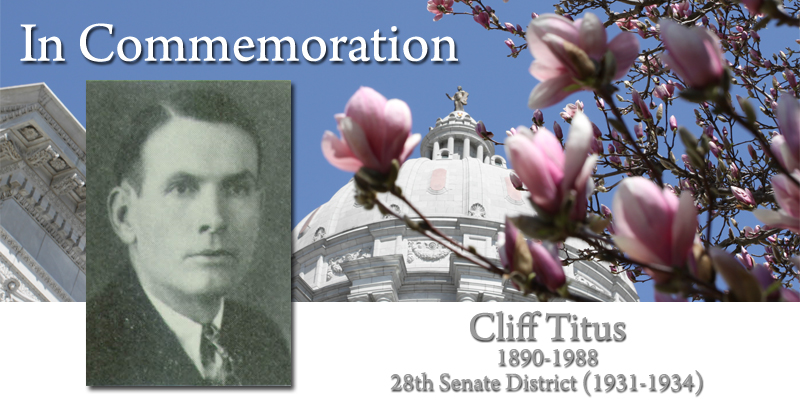 Cliff Titus served the people of the 28th District (Jasper County). Born in Fairfield, Nebraska, he received his education from public, state and theological schools in Nebraska. Senator Titus was a minister and resided in Joplin. During World War I, Senator Titus served as First Lieutenant-Chaplain with the 14th Infantry and became Captain-Chaplain of the 203rd CAC, Missouri National Guard in 1921. He was elected to the Senate in 1930, and in the 57th General Assembly acted as Secretary of the Veterans’ Legislative Club of the Legislature. (Republican)