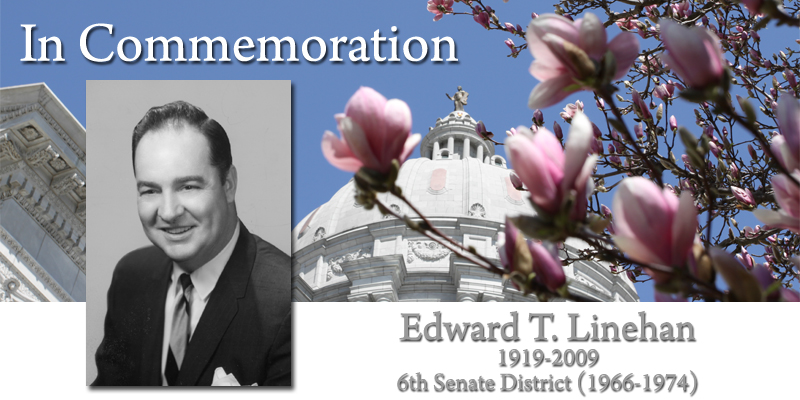 Edward T. Linehan served the people of the 6th District (part of St. Louis City). Born in St. Louis, he received his education from St. Louis parochial and public schools; Central Missouri State University, receiving a Bachelor of Science degree in education; and St. Louis University, earning Bachelor of Laws and Doctor of Jurisprudence degrees. Senator Linehan practiced as an attorney for 19 years. He served as a combat pilot in the 8th U.S. Air Force from 1942-1945. Senator Linehan was elected to the Senate in a special election in 1966. He was re-elected later that year and again in 1970. (Democrat)