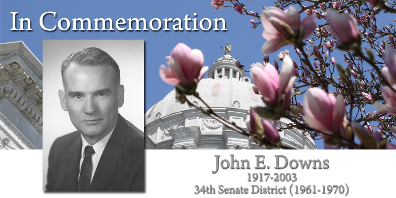 John E. Downs served the people of the 34th District (Buchanan, Caldwell, Carroll, Clinton and DeKalb counties). Born in St. Joseph, he received his education from St. Joseph schools and the University of Missouri, where he earned a Bachelor of Laws degree. Senator Downs was a practicing attorney and senior partner. He was assistant city counselor for St. Joseph; group attorney for the Security and Exchange Commission in Washington, D.C.; and a two-term prosecuting attorney of Buchanan County. During World War II, Senator Downs served as a fighter pilot in the Marine Corps in the Southwest Pacific, where he received the Distinguished Flying Cross. He was elected to the House of Representatives in 1956. Senator Downs was elected to the Senate in 1960, and re-elected in 1962 and 1966 without opposition. (Democrat)