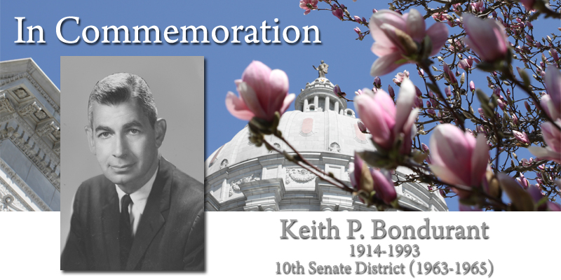 Keith P. Bondurant served the people of the 10th District (part of Jackson County). Born in Great Bend, Kansas, he received his education from Great Bend elementary and high schools; Washburn College from 1931-1933; graduated cum laude from the College of Emporia in 1935 with a Bachelor of Arts degree; and the University of Michigan Law School in 1938 with a Doctor of Jurisprudence degree. Senator Bondurant practiced law in Illinois, Tennessee and Missouri. From 1942-1946, he served in the U.S. Navy in the South Pacific Theater as an Armed Guard commander during World War II. He later returned to civilian life with the rank of lieutenant commander. Senator Bondurant was elected to the Senate in 1962. In 1965, he resigned from the Senate and was appointed as a judge in the Judicial Circuit No. 16, Div. 6. (Republican)