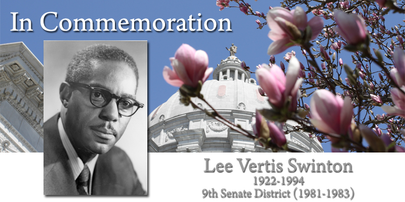 Lee Vertis Swinton served the people of the 9th District (part of Jackson County). Born in Dardanelle, Arkansas, he received his education from Coffeyville, Kansas schools; Pittsburg State College; and the University of Missouri-Kansas City, earning Bachelor of Arts and Doctor of Jurisprudence degrees. Senator Swinton was a lawyer. He was an overseas veteran of World War II; an assistant county counselor; and served six years on the Jackson County Legislature (one year as a chairman). Senator Swinton was elected to the Senate in 1980. (Democrat)
