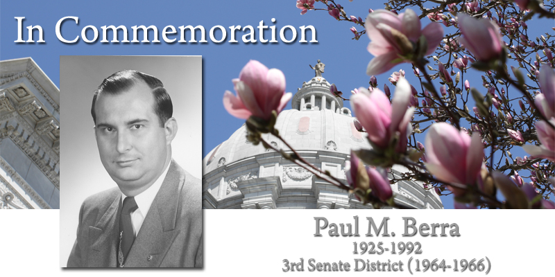 Paul M. Berra served the people of the 3rd District (part of St. Louis City). Born in St. Louis, he received his education from St. Ambrose Parochial School; Christian Brother’s High School; and St. Louis University School of Commerce and Finance. Senator Berra worked as a bookkeeper and operated a restaurant. He served in World War II with the U.S. Army in the European theater from 1943-1946. Senator Berra was elected to the House of Representatives in 1953 to fill an unexpired term. He was re-elected in 1954, 1956, 1958, 1960 and 1962. In 1964 during a special election, Senator Berra was chosen to fill an unexpired Senate term, and re-elected to a full term that same year. In 1966, he was appointed to serve as St. Louis City Treasurer. (Democrat)