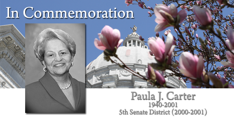 Paula J. Carter served the people of the 5th District (part of St. Louis City). Native to the St. Louis area, she was awarded the Doctor of Law degree from Lincoln University in 1999. Senator Carter worked as Chief of Staff for the 22nd Judicial Circuit Clerkâs office. She was elected to the House of Representatives, serving from 1986-1999, and elected to the Senate in 2000 in a special election. Senator Carter was the first African-American female to represent the 5th Senatorial District in St. Louis. (Democrat)