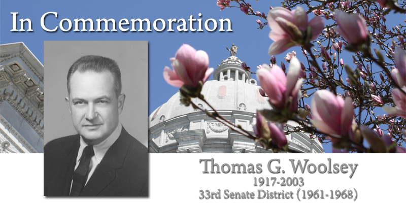 Thomas G. Woolsey served the people of the 33rd District (Benton, Camden, Cooper, Hickory, Maries, Miller, Moniteau, Morgan, Polk and St. Clair counties). Born in Warrensburg, he received his education from Webster Groves public schools; attended Westminster College for two years; and graduated from the University of Missouri School of Law with a Bachelor of Laws degree. Senator Woolsey was a lawyer and served with the U.S. Air Force in World War II. He served three terms as prosecuting attorney of Morgan County. Senator Woolsey was elected to the Senate in 1960 and 1964. He was elected Minority Floor Leader during the 74th General Assembly. (Republican)