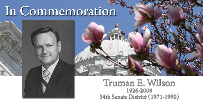 Truman E. Wilson served the people of the 34th District (Andrew, Buchanan and Platte counties). Born in St. Joseph, he received his education from Northwest Missouri State University, majoring in science and physical education and earning a Bachelor of Science degree in education. Senator Wilson taught science, physics, mathematics and physical education and was a football and basketball coach for 17 years. He was president of the Truman E. Wilson and Associates Insurance Marketing Group. Senator Wilson was elected to the House of Representatives to serve District 82 in 1968; and elected to the Senate in 1970. During the 79th General Assembly, he was elected Assistant Majority Floor Leader. (Democrat)