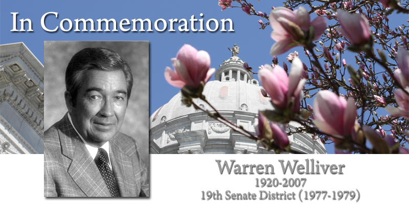 Warren Welliver served the people of the 19th District (Boone, Callaway, Howard and Randolph counties). Born in Butler, he held a Bachelor of Arts degree from the University of Missouri and a Bachelor of Laws (Doctor of Jurisprudence) degree from the University of Missouri Law School. Senator Welliver served as a lieutenant in the Navy Air Corps during World War II. He was a senior partner at a law firm in Columbia. Senator Welliver was elected to the Senate in 1976. He resigned in 1979 to accept an appointment to the Missouri Supreme Court. (Democrat)