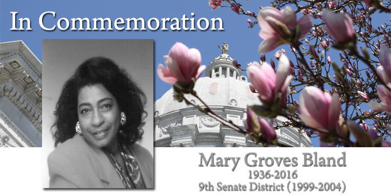 Mary Groves Bland served the people of the 9th District (part of Jackson County). Born in Kansas City, she graduated from R.T. Cole High School in 1954. She attended Ottawa University, Penn Valley and Pioneer Colleges. She also received certification in Executive Policy from Harvard University. She was a freelance community and personnel consultant and a past president of Freedom, Inc. and the Missouri Legislative Black Caucus Foundation. She was the honorary chair of the Minority Health Advisory Committee, past treasurer of the Niles Home for Children and a member of the Minority Business Advocacy Commission. Her awards included Jefferson Community Service; Outstanding Black Women, Role Model for Youth; and Outstanding Legislator. She was first elected to the House in 1980 and served there until winning a special election to the Senate in 1998. Senator Bland won re-election in 2000 and served through 2004. (Democrat)