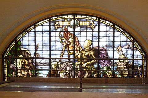 The painted window represents European exploration of the New World. Under commission of the Spanish crown in 1538, Hernando DeSoto's army crossed the Atlantic to explore the Spanish region of Florida. More than a year later, he disembarked in Havana, Cuba, to reorganize his men and supplies. They continued on to what is now Tampa Bay, Florida. DeSoto led his men through the untamed wilderness, crossed the Mississippi River, and is believed to have spent the winter in what is now Northern Arkansas. Since DeSoto and his men kept scant records of their travels, their exact path through North America has not been precisely determined.