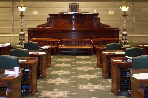 To maintain the historical integrity of the chamber during the renovation, the carpeting was replaced with Exminster wool carpeting from England. While the type of wool matches the original chamber carpeting, a pattern was added to highlight the effect of the floor covering in the room.