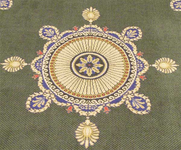 Produced in three pieces, the chamber floor carpet is an olive green in background, on which large circular designs remindful of the interior of the Senate dome are woven at regularly spaced intervals.