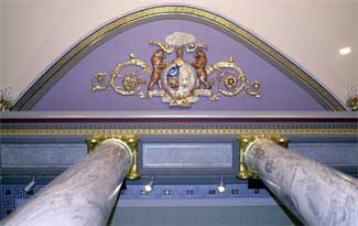Moulding, in an array of scrolled fretwork and varied patterns, serves to define the chamber's interior borders. As with the carvings, every inch of millwork was carefully stripped, cleaned and painstakingly refinished.