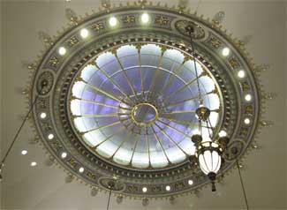 From the skylight hang four majestic chandeliers (middle photo, right) whose illumination blends with the natural light that filters into the room, shifting highlights as the sun travels across the sky. The chandeliers are cast of bronze and are hand-finished.