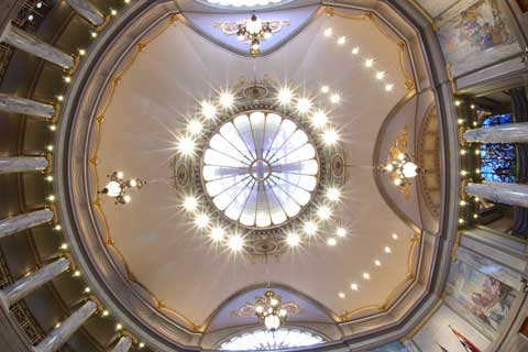 The north and south walls feature vertical skylights (bottom left) that accent the main lighting of the chamber. Each skylight is crested with a magnificent rendition of the state seal, complete with gilded crown, shield and grizzly bears that are unique to the emblem of the State of Missouri.