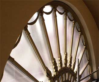 From the chamber and galleries, the glass panels appear to be light blue in color. The panels are actually a neutral color and derive their distinctive blue shade from an exterior skylight made of small glass blocks. These once-clear blocks have changed color due to oxidization from the continued effect of sunlight on them over most of the past century.