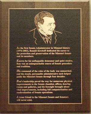 Mr. Kirchoff, who passed away April 27, 2004, was a fixture in the Missouri Senate for 34 years, serving as Director of Printing and Mailing, Director of Research and the position he was most well-known for, that of the first Senate Administrator in Missouri history. Former Sen. Harold Caskey led a motion to name the gallery after Mr. Kirchoff, and the motion was adopted.