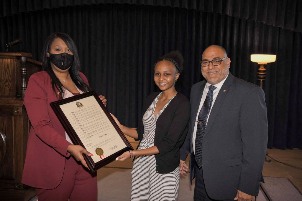 On Monday, April 19, I was honored to present a resolution to Stephanie Njeri, one of the recipients of this year’s Women Legislators of Missouri Scholarship. Each year, 16 young women who are graduating from high school, two from each Missouri congressional district, are chosen to receive this $1,000 award. At a reception on Monday, I was happy to speak with Stephanie and congratulate her on this incredible achievement. These young women are chosen because of their leadership abilities and their willingness to make a difference in their communities. The applicants must also submit a 500 word essay on the topic: “As women legislators, we are honored and privileged to serve the people of Missouri. If you were a state legislator, what would you hope to accomplish and why?” I am extremely proud of Stephanie and her hard work to earn this scholarship. I wish her the best of luck in her future endeavors.