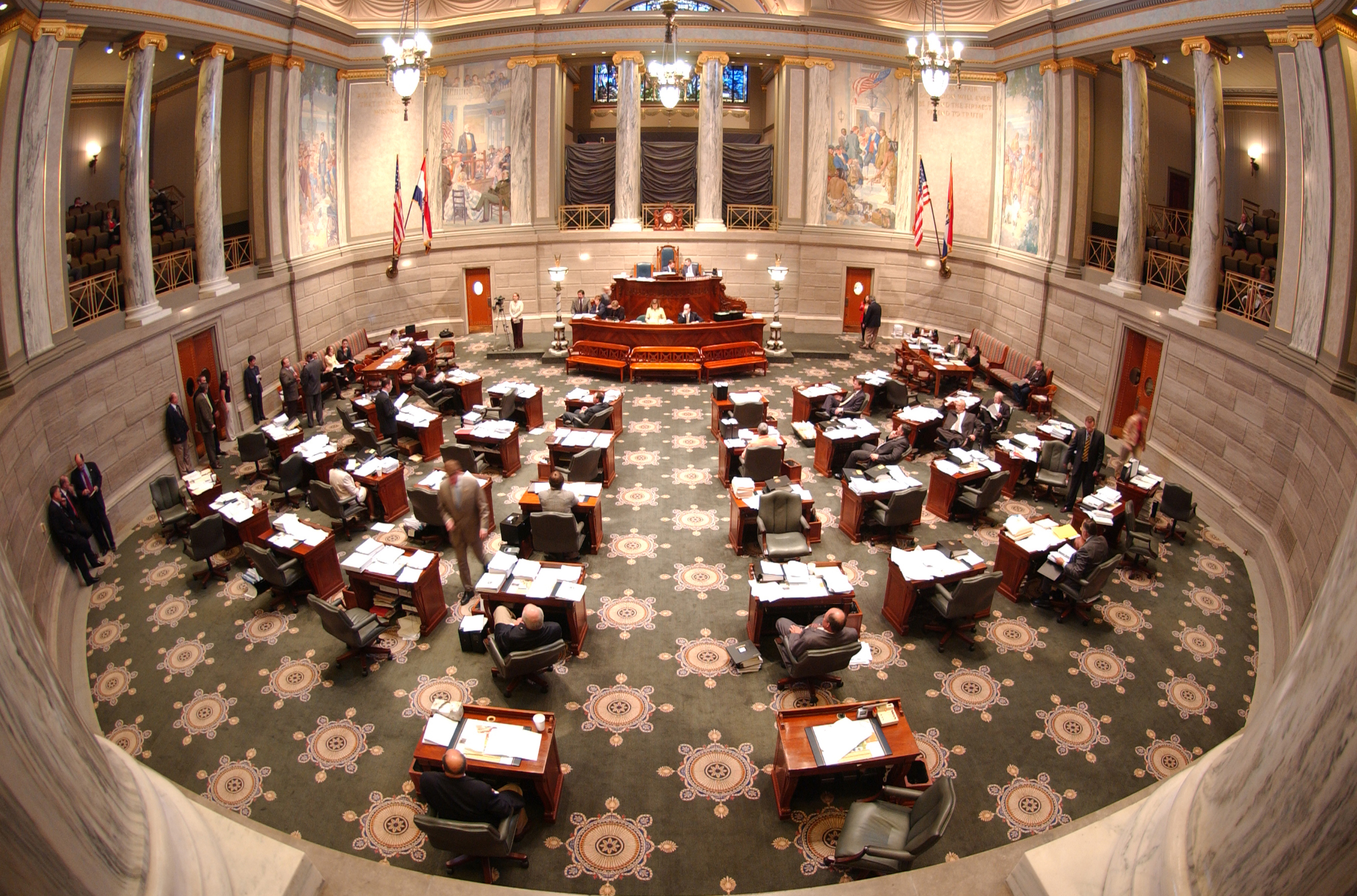 A shot of the Senate Chamber taken from the upper gallery, where visitors and guests can watch lawmakers during session.