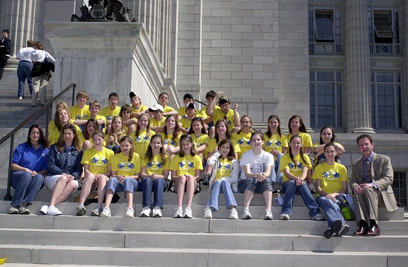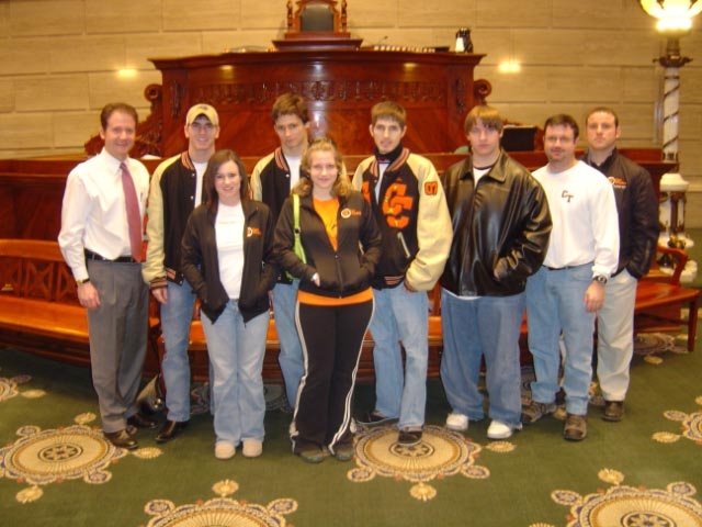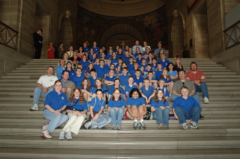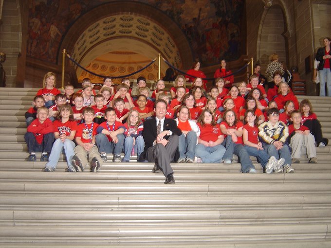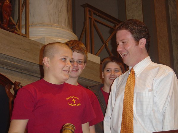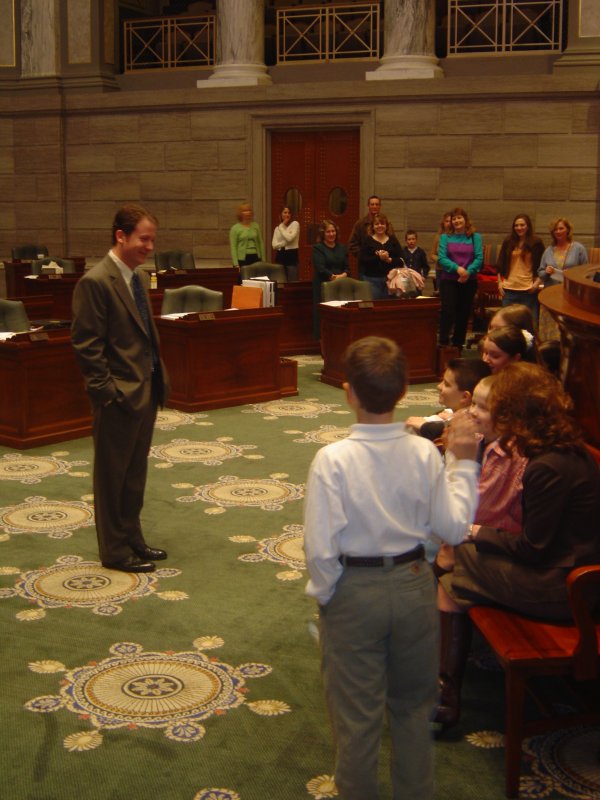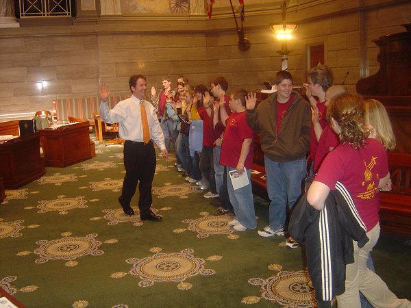 Nell Holcomb Elementary Students pose for a picture with Senator Crowell Students get their chance to pound the gavel of the Missouri State Senate Senator Crowell swears in students from Trinity Lutheran as honorary Junior Senators Senator Crowell talks with students from Trinity Lutheran as they eat lunch in the Capitol Rotunda