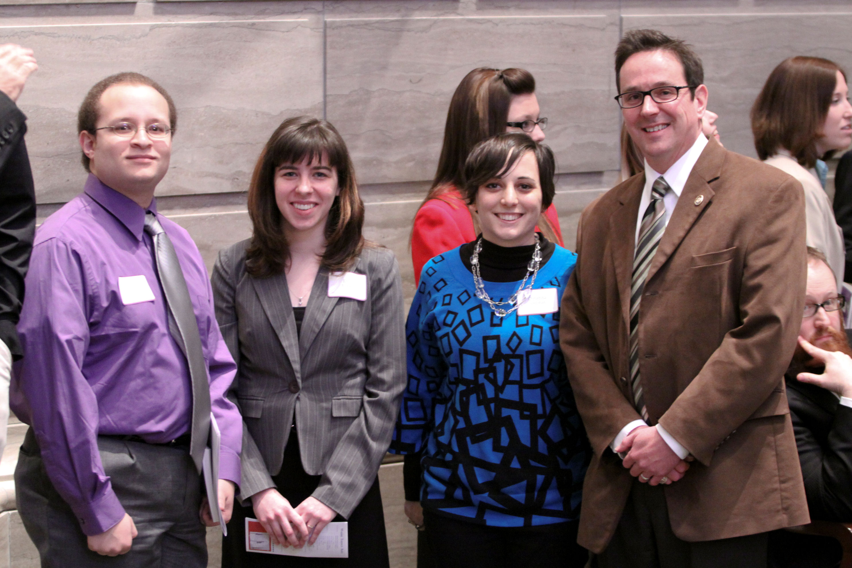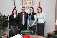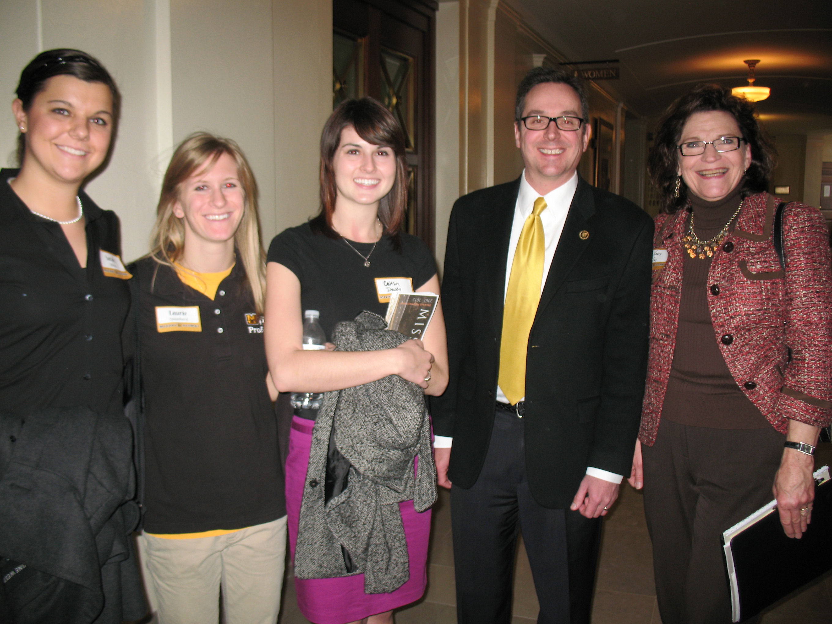 - Left to right, Health sciences senior Sarah White, radiography senior Laurie Spaunhorst, speech-language pathology senior Caitlin Dawdy, Senator Kurt Schaefer and SHP Alumni Organization President Nancy Fay during the students visit at the Capitol.
