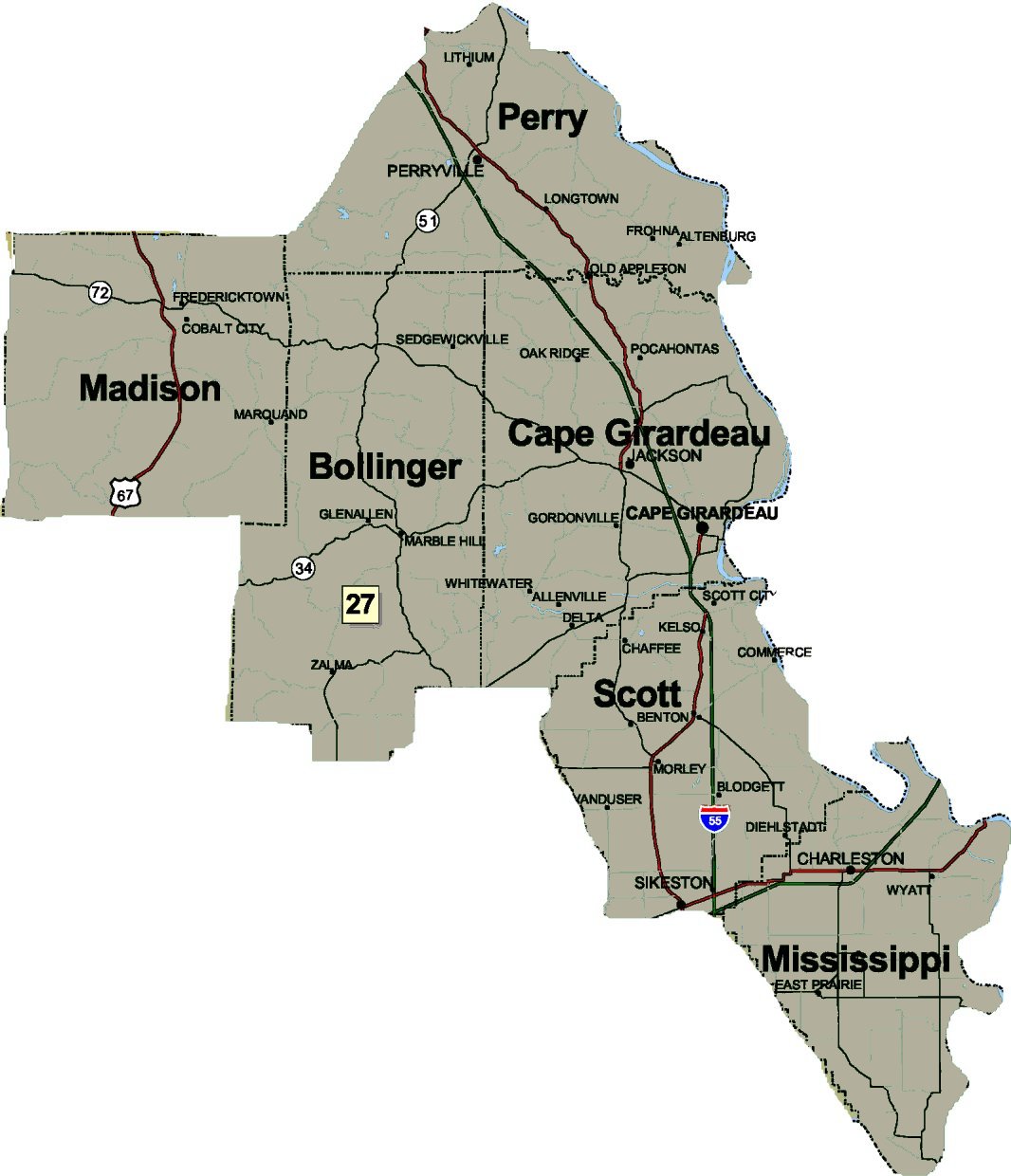 Bollinger, Cape Girardeau, Madison, Mississippi, Perry and Scott