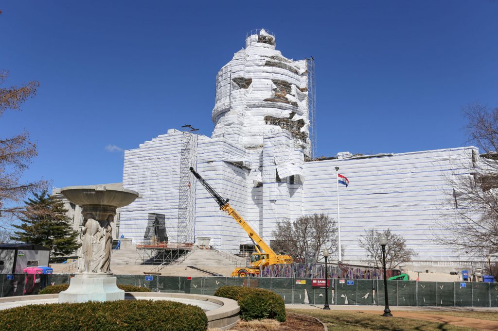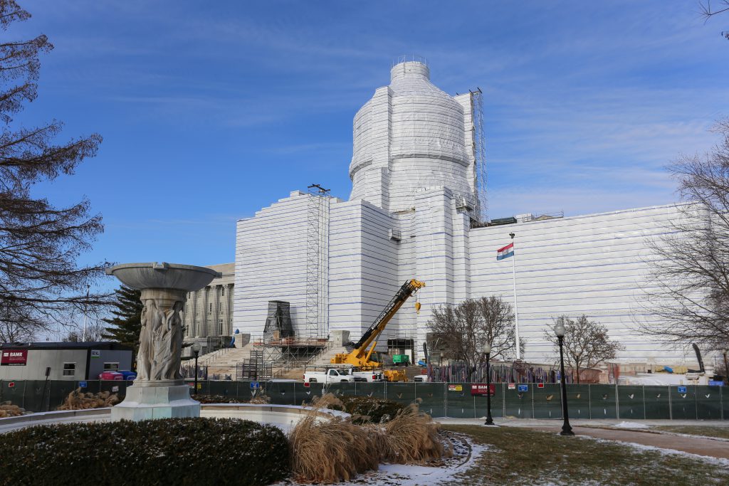 The construction on the Capitol Building is moving along, and I wanted to share some pictures of its progress and the hazards of severe weather. As you can see in the second picture, the high winds we experienced a few weeks ago tore the protective cover off the building in certain areas.