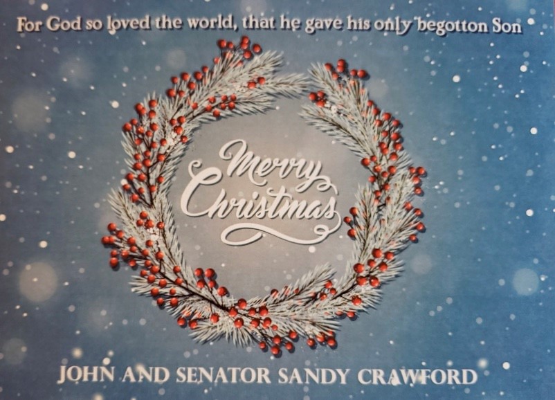 During this joyous holiday season, it is my sincere hope that you are able to spend time with those you cherish the most. While you are celebrating this holiday season, please remember all the military men and women serving our country. Many of them will not be able to come home for Christmas. For me, the holidays present an opportunity to reflect on the past year, consider my many blessings, and to look forward to a new year full of possibilities.