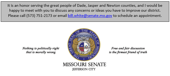 My colleagues and I approved an alternative redistricting plan to the one created by Amendment 1, commonly referred to as “Clean Missouri”. Senate Joint Resolution 38, if approved by the Missouri General Assembly and voters next November, will allow independent, bipartisan citizen commissions to establish legislative boundaries instead of a state demographer. I believe this redistricting plan is a better and more transparent method than what is authorized in “Clean Missouri”. I also believe the resolution builds on the positive components of Amendment 1 and completely bans lobbyist gifts. Campaign contributions for senatorial candidates are further reduced to $2,400 per election. Since SJR 38 is being vetted through the legislative process, which is a more deliberate and thorough evaluative process, I believe it will be a more fair method for Missouri redistricting.
