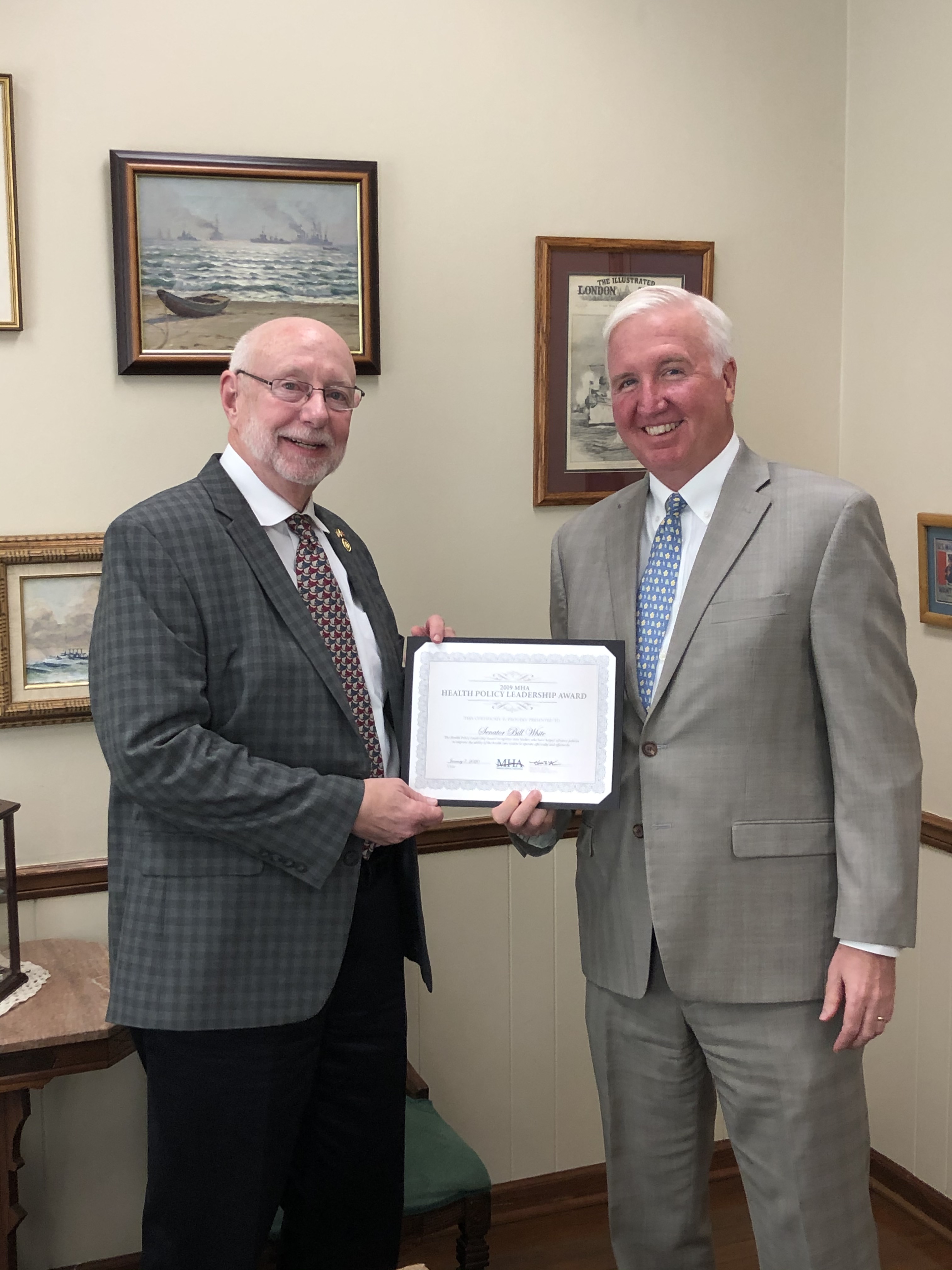 On Nov. 7, I was the humble recipient of the Missouri Hospital Association’s (MHA) 2019 Health Policy Leadership Award. Ron Monsees, vice president of State Legislation for the association, presented the plaque at their annual convention in Osage Beach. MHA selected me for this honor for my efforts to streamline regulatory requirements and ensure that patients and caregivers are at the center of care, instead of the insurance companies. “Senator White has been a champion of improving health and health care in southwest Missouri and statewide” said Paula Baker, President and CEO of Freeman Health System in Joplin, MO. MHA spearheaded the Reimagine Rural Health campaign in 2019 to help rural areas have better access to quality and affordable care.
