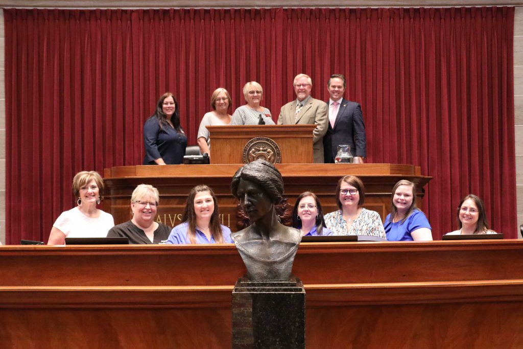 Current Jasper County clerk and former state representative, Charlie Davis, provided some historical context at the dedication ceremony. This photo was taken on the House dais after Speaker Elijah Haahr publicly unveiled the bust during Wednesday’s ceremony. Standing on the top row, from left to right, are Mary Lou Newman-Teel, Carla Palmer, Lisa Perry, Charlie Davis and Speaker Haahr. The lower row consists of Cathy Loy, Patty Moss, Shala Cochrane, Chrystal Fast, Terrie Dawald, Crystal Lees and Annie Golden.