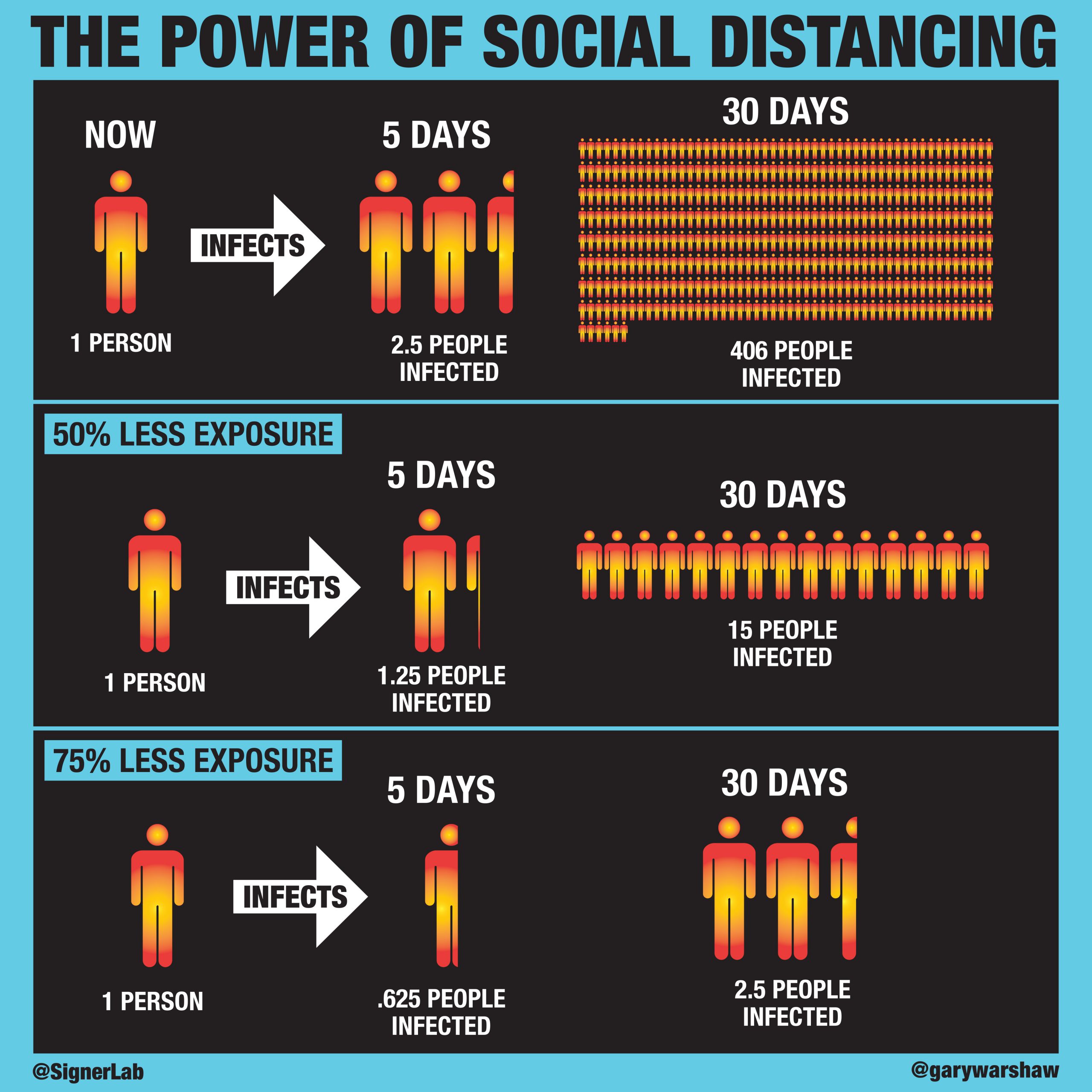 The table below shows the positive impact of social distancing, and it was created by Gary Warshaw, Art Director, and Robert A.J. Signer, Ph.D., Assistant Professor of Medicine, from the University of California San Diego.