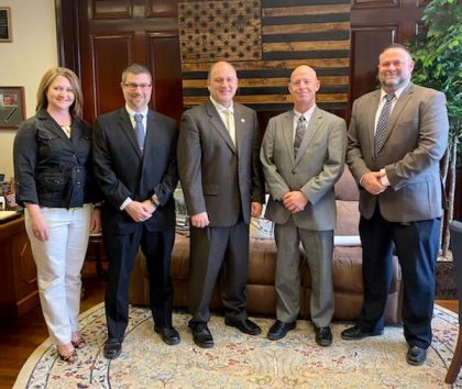 Sen. Hoskins welcomed school superintendents from the 21st District to the Capitol. Shown with Sen. Hoskins, from left, are: Susan Crooks, Leeton R-X School District; Steve Ritter, Sherwood Cass R-VIII School District; Derek Lark, Santa Fe R-X School District; and Scott Archibald, Orrick R-XI School District.