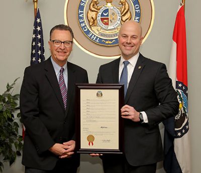 JEFFERSON CITY — State Sen. Tony Luetkemeyer, R-Parkville, has presented a Senate Resolution to the St. Joseph Chamber of Commerce in recognition of the group’s 100th annual banquet. Senator Luetkemeyer presented the resolution to chamber President R. Patt Lilly during Great Northwest Days at the State Capitol.