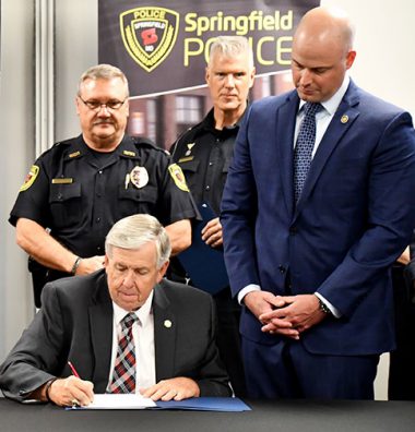 JEFFERSON CITY — With a stroke of his pen, Missouri’s governor has made Missouri a safer place. The governor signed Senate Bill 600 into law as a group of Missouri law enforcement officers and prosecutors looked on during a signing ceremony at the Springfield Police Department. The legislation, sponsored by State Sen. Tony Luetkemeyer, R-Parkville, increases penalties for violent offenses and provides additional prosecutorial tools to help keep dangerous criminals behind bars.
