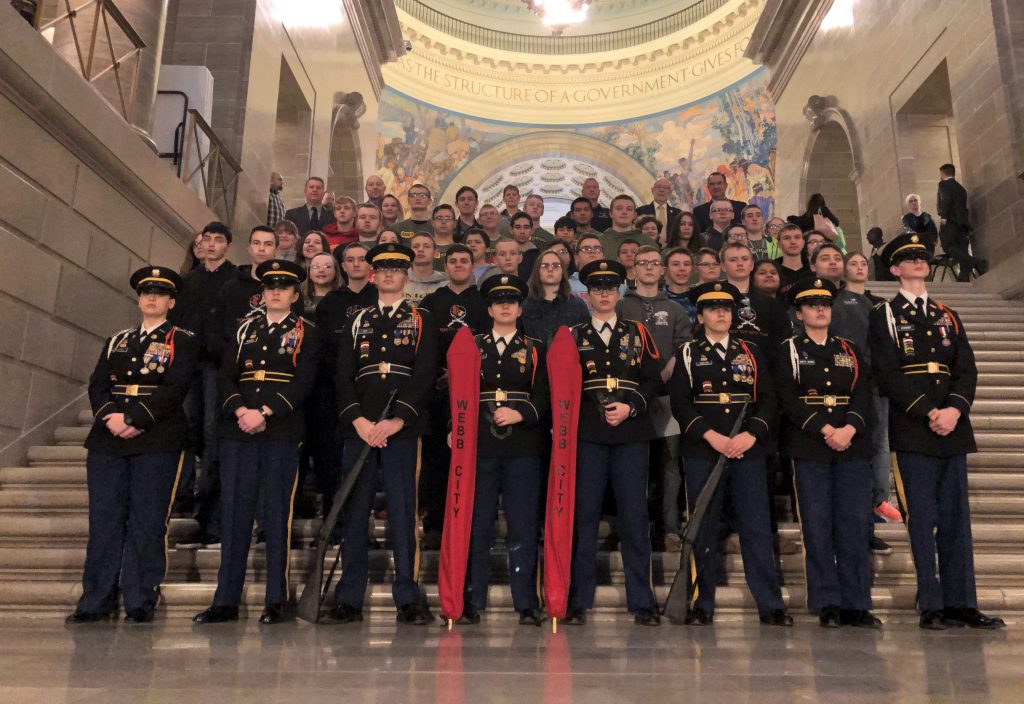 JEFFERSON CITY – Approximately 50 members of the Webb City Army Junior Reserve Officers’ Training Corps (ROTC) visited the State Capitol on Feb. 25. During their visit, they met with their state representatives and Sen. Bill White, gave a brief color guard performance, watched a live floor debate in both chambers of the General Assembly and received a Senate Resolution for their accomplishments in recent regional competitions.