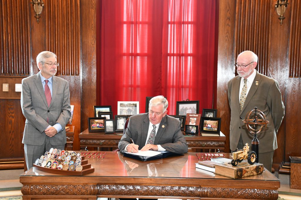 Representative Wallingford and Sen. White watch Gov. Parson sign SB 44 into law on July 6.