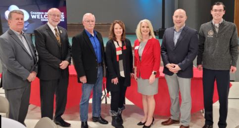 Representative Bromley, Sen. White, Rep. Roberts, Rep. Kelley, Carthage Chamber of Commerce Director Julie Reams, Rep. Smith and Rep. Deaton gather during Carthage’s annual Eggs and Issues event.